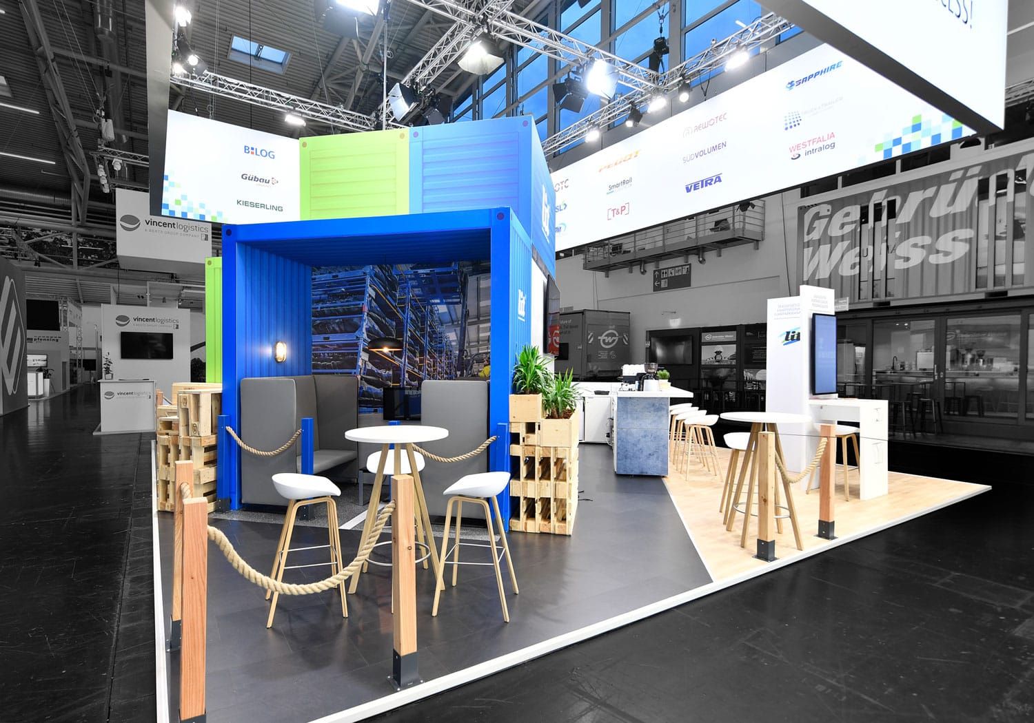 Gestalterisch war schnell klar, wohin die Reise geht: Die Nähe zur See, die in der DNA der L.I.T. AG liegt, sollte sich auch im Stand widerspiegeln. Die Theke wurde zur stilisierten Schiffsbug, die Materialien erinnerten an Containerflächen und Schiffsbleche, ergänzt durch Seile, Reling, Poller und klassische Schiffslampen – präzise dosiert und auf Systembauweise abgestimmt. So entstand ein klarer, eigenständiger Look, der sofort ins Auge fiel – und im Gedächtnis blieb.